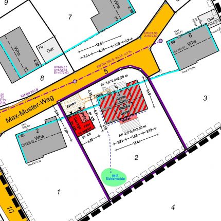 Darstellung der geplanten Gebäude in einem Lageplan entsprechend der Vorgaben der jeweiligen Landesbauordnungen durch einen Vermessungsingenieur (Sachverständigen).
