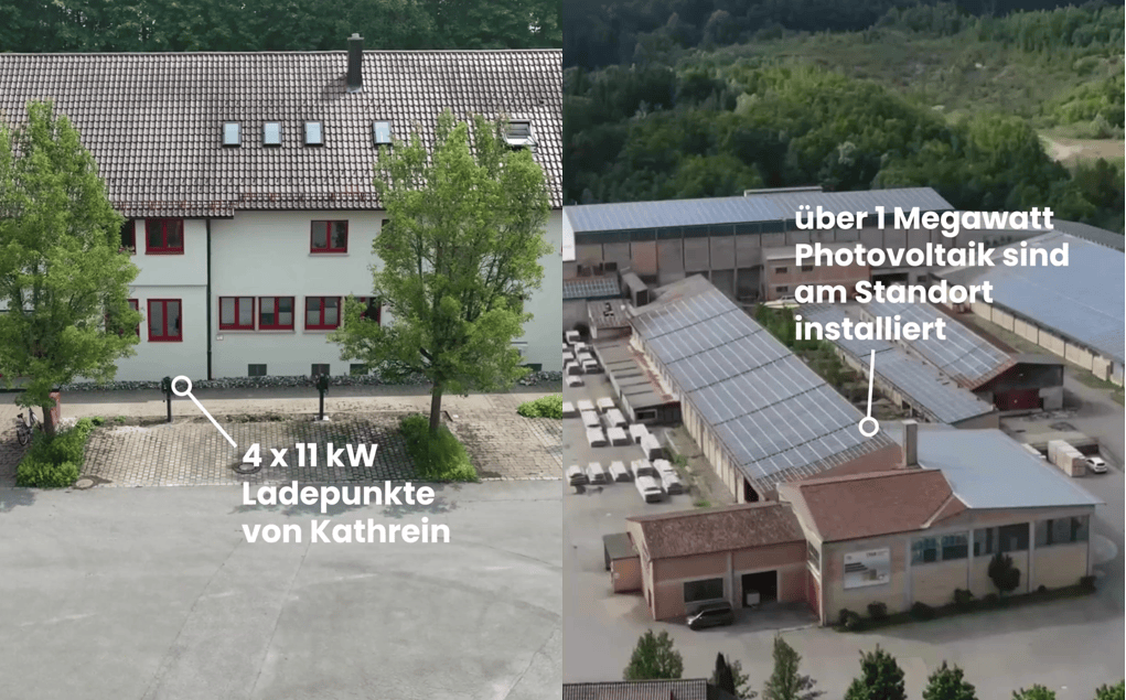 Frisch eingebaut sind seit Juni bei uns vier Kathrein-Ladepunkte mit jeweils 11 kW Leistung. Ergänzt wird das E-Ladeangebot durch die Photovoltaikanlage auf den Dächern der Ziegelwerkhallen mit über 1 MW installierter Leistung.
