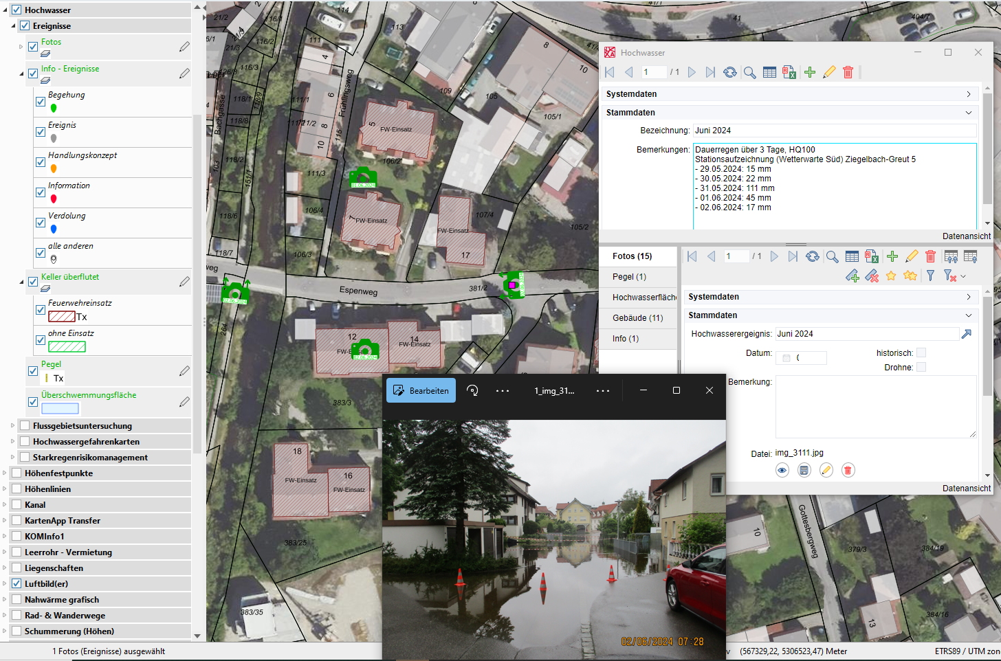 So manche Kommune dürfte in der Vergangenheit - teilweise auch mehrfach - bereits leidvolle Erfahrungen mit Hochwassern gemacht haben. Die dabei vor Ort von Betroffenen sowie Einsatzkräften gewonnenen Erkenntnisse samt fotografischer Dokumentation können in der Modul-Ebene „Ereignisse“ zentral gesammelt werden (vgl. Abbildung 1). So geraten diese wertvollen Informationen nicht in Vergessenheit und bilden eine fundierte Datengrundlage zur Identifizierung von Gefahrenzonen und zur Planung von Schutz- und Einsatzmaßnahmen.