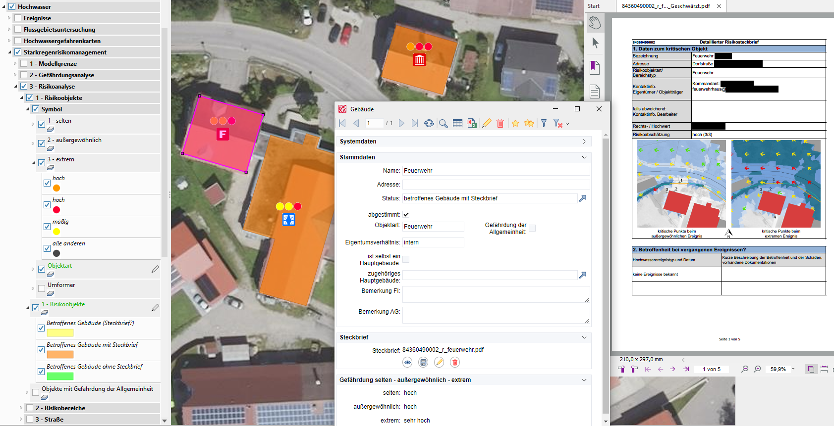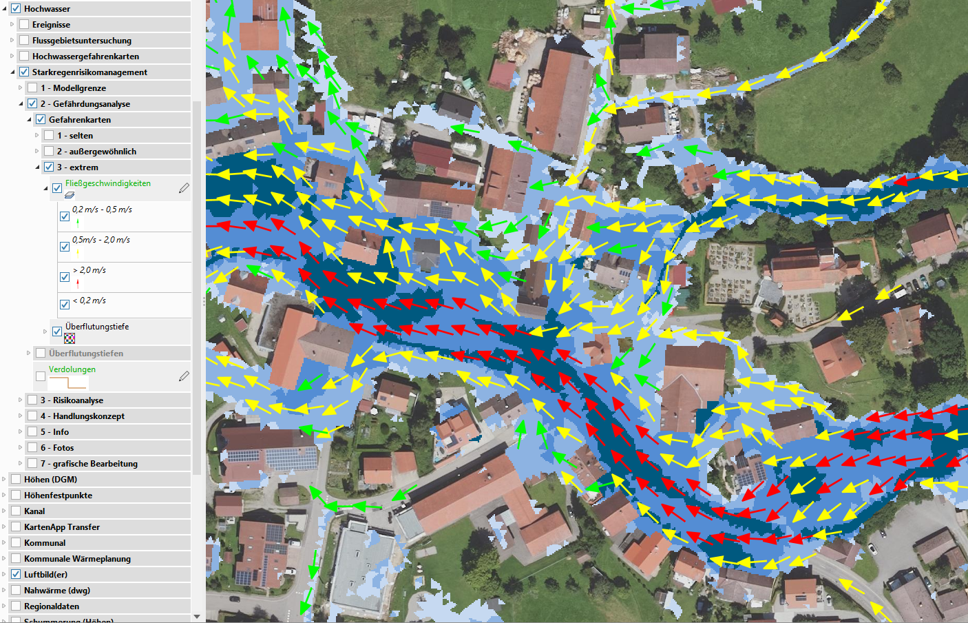Die Fassnacht Ingenieure GmbH ist ein durch die Landesanstalt für Umwelt Baden-Württemberg (LUBW) für das Starkregenrisikomanagement (SRRM) zertifizierter Betrieb. Gefährdungsanalyse (vgl. Abbildung 3), Risikoanalyse (vgl. Abbildung 4) und Handlungskonzept (vgl. Abbildung 5) werden nach den vorgegebenen Standardreferenzen von den Fachleuten unseres Ingenieurbüros durchgeführt bzw. erstellt und können ebenfalls im GIS-Modul „Hochwasser“ verwaltet werden.